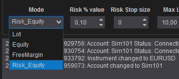 - Mode – Volume calculation mode for MT. “Lot” – the fixed volume for one contract. “Equity” – the volume is calculated from the specified percentage of equity. “FreeMargin” – the volume is calculated from the specified percentage of free margin. “Risk_Equity” – the size of the lot is calculated from the percentage of risk from the equity and the size of the Stop order in ticks: