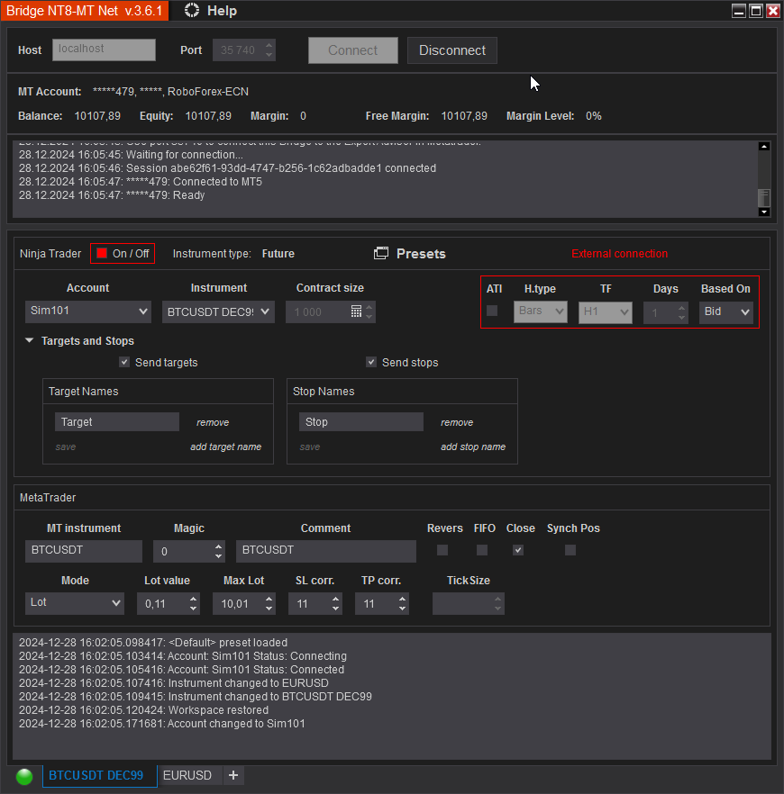 * For the bridge to work properly, the size of the corrections must be greater than the spread. Since the logic of the strategy is assigned to NinjaTrader, targets and stops are needed only to prevent unforeseen situations, such as loss of connection on a bridge, etc. - TickSize – Tick size for the MT symbol. Calculated automatically. If MT returns 0, you need to set it manually. If, when trying to connect, the “TickSize” field remains empty, check the spelling of the Symbol name.