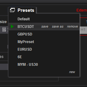 The last loaded preset is marked with a green indicator. If the settings are loaded from the Workspace, the indicator is not active.